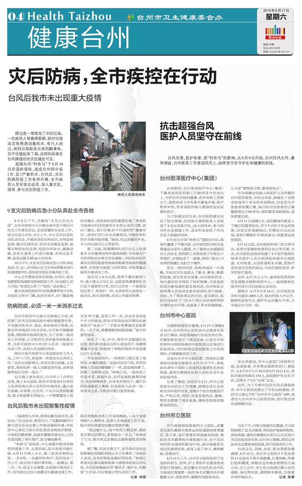 超强台风“利奇马”于8月10日在温岭登陆,造成台州部分县(市、区)严重积水。台风后,灾后防病防疫工作有序开展,全市疾控人员全体总动员,深入重灾区,指导、参与灾后防疫工作。